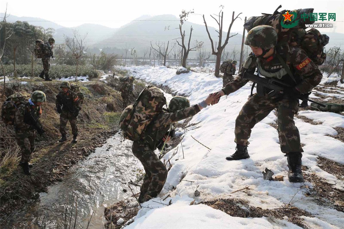 一路奔襲,一路障礙。深山老林的白雪像棉被一樣群山覆蓋,特戰(zhàn)隊(duì)員一腳踩進(jìn)竹林地,積雪就沒過了大腿;融化的積雪凝固成滑冰,走在崎嶇的山路,稍不注意就會(huì)滑倒摔傷;濕滑泥濘的山路好像遍布膠水,特戰(zhàn)隊(duì)員從中穿過,戰(zhàn)靴靴底積滿了一層3厘米的泥巴;在鐵路旁的鄉(xiāng)間小道,每隔半米就有一個(gè)水坑,特戰(zhàn)隊(duì)員拖著疲憊的雙腿,趟過幾十個(gè)大大小小的水坑……