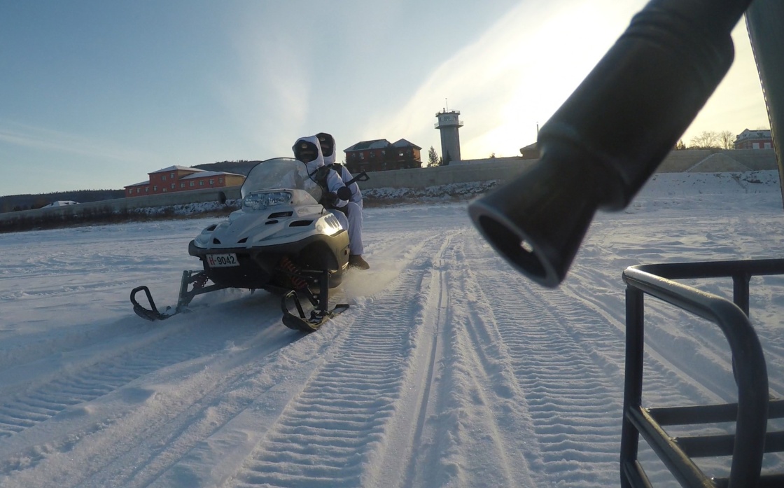 駐守在漠河縣北極村的北部戰(zhàn)區(qū)陸軍某部官兵在江面巡邏(2月5日攝)。