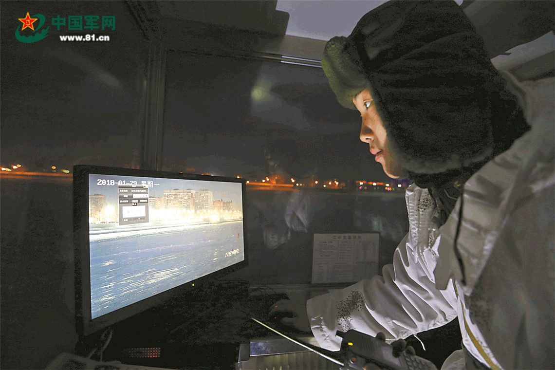 界江哨位上,哨兵利用紅外線視頻監(jiān)控系統(tǒng)觀察邊境情況。