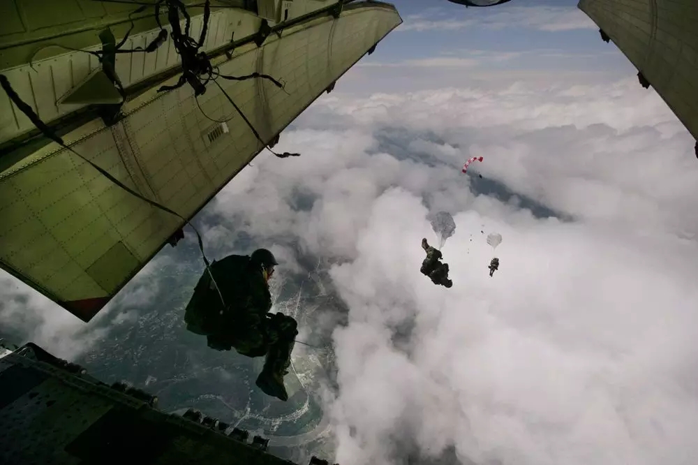14日中午12時左右,運輸機一步步接近震中茂縣災區(qū),并開始在其上空盤旋,尋找最合適的傘降時機。大約5分鐘后,運輸機下方的云層突然散開一個傘降窗口,透過這個窗口可以看到茂縣城關大橋,于是傘降指揮官立即抓住轉瞬即逝的有利時機,果斷下達傘降命令,李振波大校第一個躍出機艙,緊隨其后的是6名傘降隊員。瞬間,雪白的傘花朵朵綻放,飄向孤城茂縣。