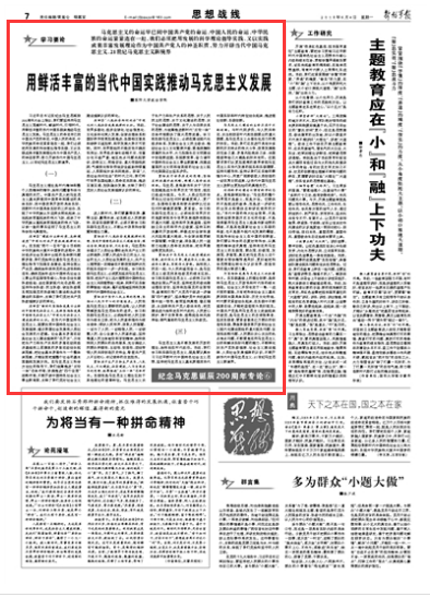 習(xí)近平總書(shū)記在紀(jì)念馬克思誕辰200周年大會(huì)上指出,我們要堅(jiān)持用馬克思主義觀察時(shí)代、解讀時(shí)代、引領(lǐng)時(shí)代,用鮮活豐富的當(dāng)代中國(guó)實(shí)踐來(lái)推動(dòng)馬克思主義發(fā)展。馬克思主義的命運(yùn)早已同中國(guó)共產(chǎn)黨的命運(yùn)、中國(guó)人民的命運(yùn)、中華民族的命運(yùn)緊緊連在一起,我們必須把用發(fā)展的科學(xué)理論指導(dǎo)實(shí)踐、又以實(shí)踐成果豐富發(fā)展理論作為中國(guó)共產(chǎn)黨人的神圣職責(zé),努力開(kāi)辟當(dāng)代中國(guó)馬克思主義、21世紀(jì)馬克思主義新境界。請(qǐng)關(guān)注今日出版的《解放軍報(bào)》的文章——