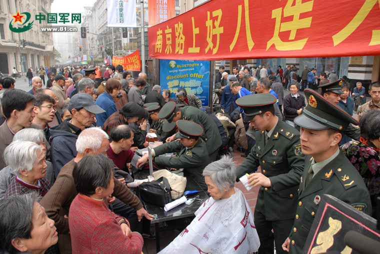 像這樣的老人,在八連的服務(wù)點(diǎn)前經(jīng)常出現(xiàn)。這些老人,在年輕時(shí)就與當(dāng)時(shí)八連的官兵結(jié)下了深厚的友誼,隨著時(shí)間的流逝,老人們搬離了南京路邊的石庫門,八連戰(zhàn)士也更替了數(shù)代,甚至八連鐵打的營盤,也從南京路移防。不過,無論風(fēng)霜雨雪,在每一個(gè)為民服務(wù)日回到南京路,看看那些朝氣蓬勃的身影,縱使自己已芳華不再,恐怕每位老人的心中亦足感慰懷。在這些似曾相識(shí)的場景中,老人們看到了永不斷絕的薪火賡續(xù)。