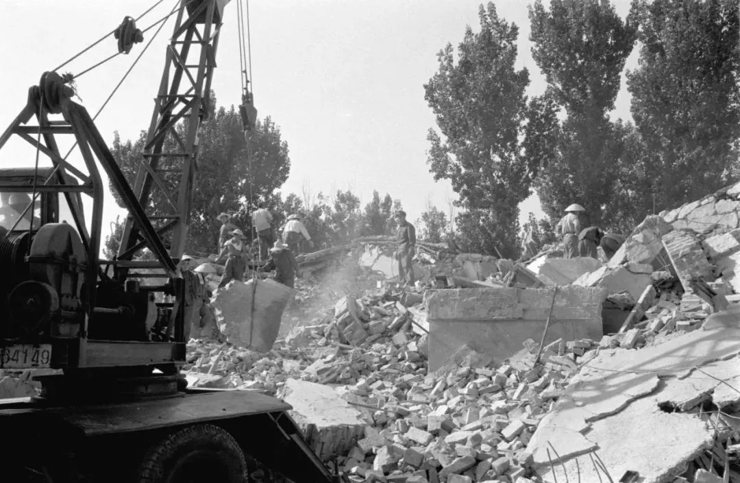 1976年7月28日,強烈地震中,唐山礦業(yè)學(xué)院宿舍樓被震毀。新華社記者官天一攝