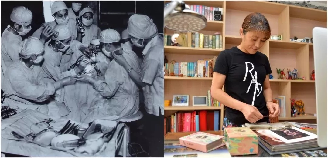 拼版照片:左圖為唐山大地震發(fā)生后,上海醫(yī)療隊在給傷員做手術(shù)(資料照片);右圖為2016年7月24日,“地震嬰兒”孫滬在家中整理老照片(新華社記者牟宇攝)。