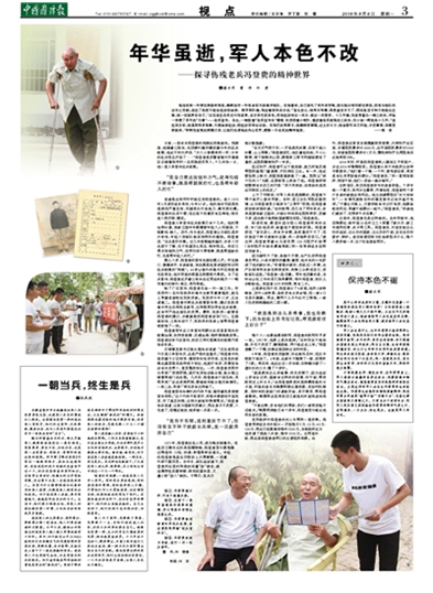 是什么樣的品質(zhì)和力量,支撐和充盈著一個普通傷殘退伍軍人精神世界?與馮登貴深入接觸后,筆者心情久久不能平靜。從這位平凡而高尚的老人身上,筆者看到軍人本色迸發(fā)的光輝,觸摸到軍人本色釋放的力量,感受到軍人本色堅守的意義。請關(guān)注今日《中國國防報》的報道——