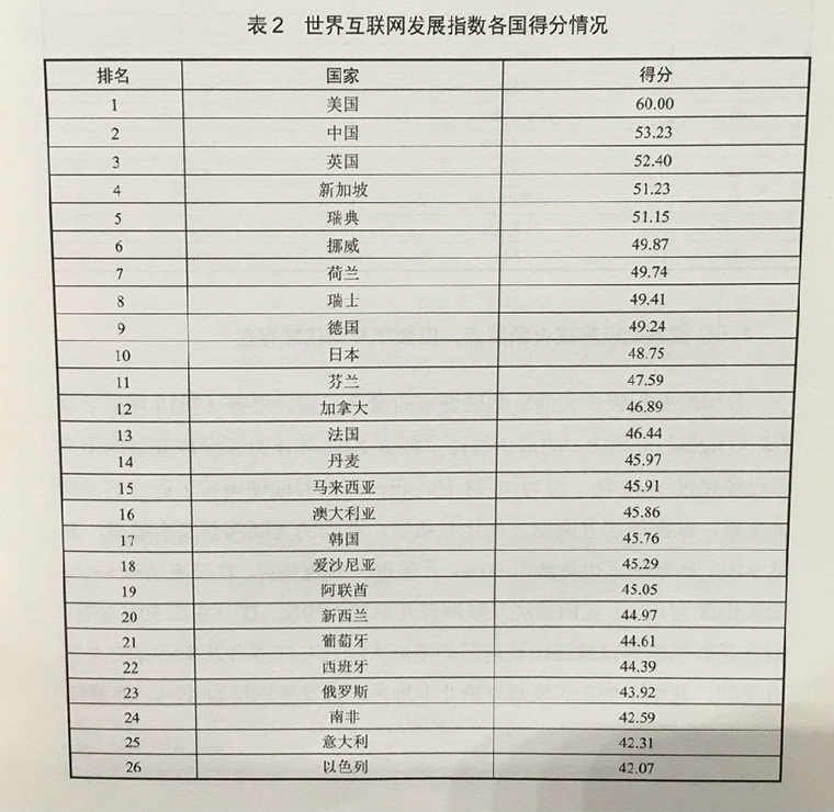記者從發(fā)布會(huì)上獲悉,在2018世界互聯(lián)網(wǎng)發(fā)展指數(shù)排行中,中國排名第二。該指標(biāo)體系在去年38個(gè)國家的基礎(chǔ)上,新增了7個(gè)國家,涵蓋五大洲的主要經(jīng)濟(jì)體和互聯(lián)網(wǎng)發(fā)展具有代表性的國家,能夠基本反映當(dāng)前各大洲和世界主要國家的互聯(lián)網(wǎng)最新發(fā)展?fàn)顩r。
