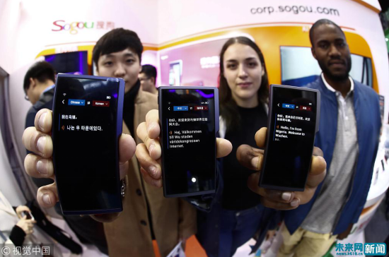 在浙江烏鎮(zhèn)舉行的第五屆世界互聯(lián)網(wǎng)大會(huì)“互聯(lián)網(wǎng)之光”博覽會(huì)會(huì)場(chǎng)內(nèi),中外與會(huì)嘉賓體驗(yàn)搜狗翻譯寶Pro。它支持42種語(yǔ)言的在線(xiàn)語(yǔ)音翻譯,采用了全球獨(dú)創(chuàng)的神經(jīng)網(wǎng)絡(luò)機(jī)器翻譯技術(shù)以及基于新版NMT技術(shù)研發(fā)的離線(xiàn)神經(jīng)機(jī)器翻譯技術(shù)。圖據(jù)視覺(jué)中國(guó)