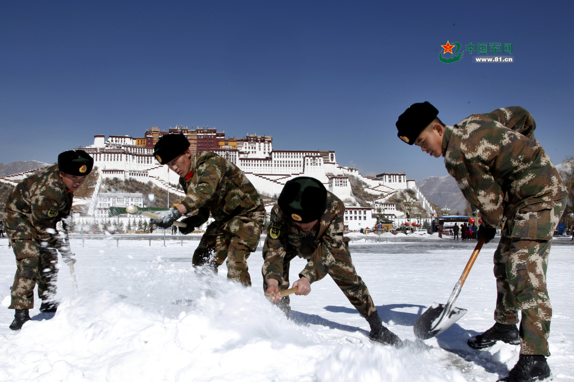 戰(zhàn)士在布達(dá)拉宮廣場(chǎng)除雪。