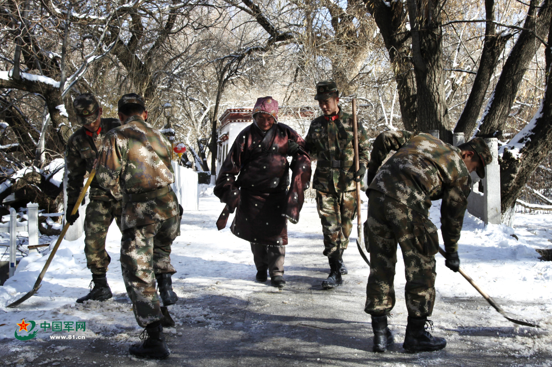 戰(zhàn)士在宗角祿康公園內(nèi)除雪并幫助過往市民度過易滑路段。