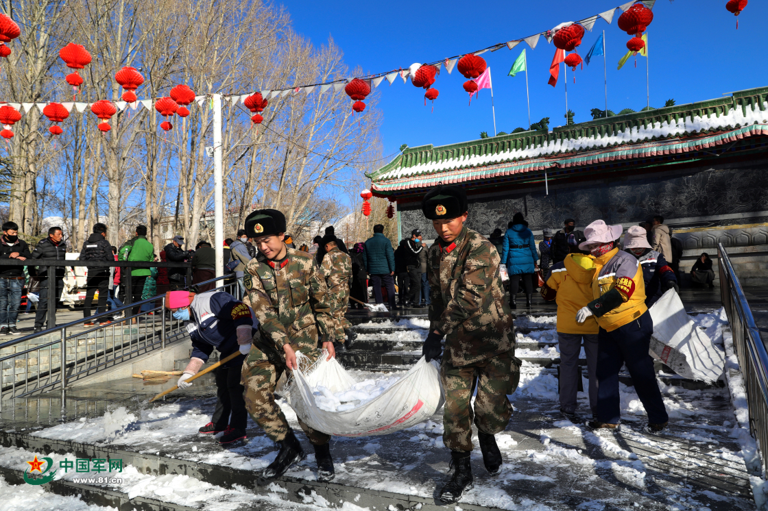 戰(zhàn)士與市民共同在拉薩市宗角祿康公園內(nèi)除雪。