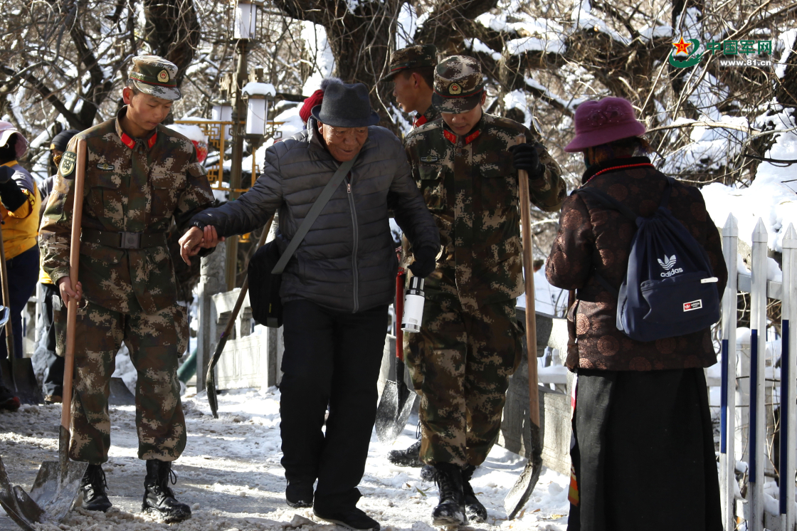 戰(zhàn)士在布達(dá)拉宮廣場除雪并幫助過往市民度過易滑路段。