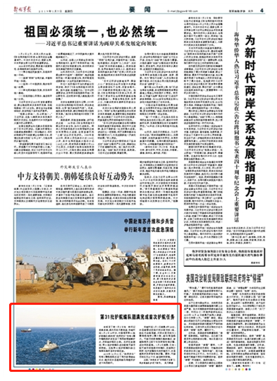 當(dāng)?shù)貢r間1月2日12時許,中國海軍第31批護(hù)航編隊順利將“和煦歡樂”號等3艘外籍船舶護(hù)送至亞丁灣西部海域解護(hù)點(diǎn),并和被護(hù)船隊分航。此次任務(wù)期間,第31批護(hù)航編隊成功驅(qū)離可疑目標(biāo)兩批。這是第31批護(hù)航編隊獨(dú)立指揮實施的首次護(hù)航任務(wù)。請關(guān)注今日《解放軍報》的報道——