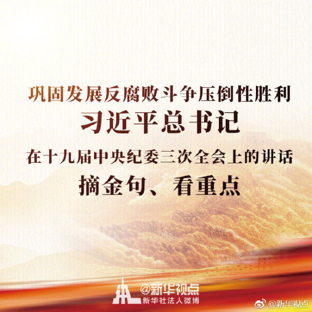 【鞏固發(fā)展反腐敗斗爭(zhēng)壓倒性勝利——習(xí)近平總書記在十九屆中央紀(jì)委三次全會(huì)上的講話,摘金句、看重點(diǎn)】中共中央總書記、國(guó)家主席、中央軍委主席習(xí)近平11日上午在中國(guó)共產(chǎn)黨第十九屆中央紀(jì)律檢查委員會(huì)第三次全體會(huì)議上發(fā)表重要講話。戳圖看金句。