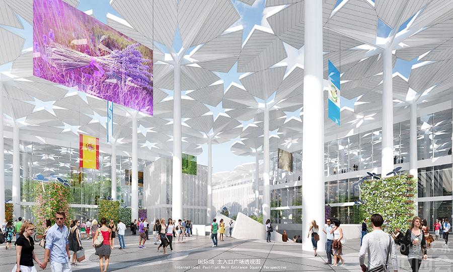 此外,國際館利用建筑遮陽、自然通風(fēng)、太陽能光伏發(fā)電、蒸發(fā)冷卻降溫、滴灌技術(shù)和雨水回收利用等可持續(xù)技術(shù),成為一座綠色、環(huán)保的低能耗建筑。外立面采用玻璃幕墻,并在頂面設(shè)計了天窗,最大限度保證場館的自然采光和通透性。花傘的立柱可將收集屋面雨水,使其滲入蓄水池,當(dāng)雨水過多時,將會流入排水溝,用于景觀用水、綠化用水、路面沖洗等。在花傘的上方采用新型光伏發(fā)電材料,提高光伏發(fā)電效率,用于整個建筑的內(nèi)照明、動力等用能需求。