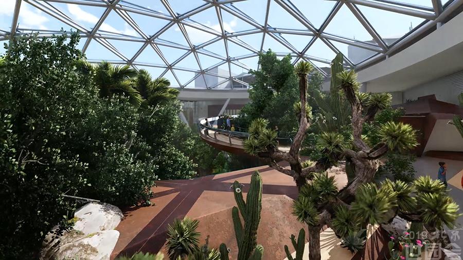 植物館建筑分為三層,一層設(shè)有熱帶植物溫室,占地約3000平方米,匯聚600多種珍貴植物。通過紅樹林、熱帶雨林、蕨類、棕櫚、多漿植物、食蟲植物、苔蘚等展現(xiàn)植物王國的多樣性以及植物生存和適應(yīng)環(huán)境的智慧,設(shè)有5大展區(qū)12個景點。人工紅樹林,再現(xiàn)紅樹林適應(yīng)海潮漲落演化出的胎生、支柱根、泌鹽等特征,彰顯海岸衛(wèi)士的生態(tài)功能;熱帶雨林著力展現(xiàn)植物與植物、植物與動物之間競爭、協(xié)同的關(guān)系,如空中花園、獨木成林、老莖生花、滴水葉尖、巨葉現(xiàn)象、絞殺現(xiàn)象等;棕櫚科植物和蕨類植物展示其卓越的傳播繁衍智慧;多漿植物通過莖葉的變態(tài)進化出適應(yīng)干旱環(huán)境的能力;食蟲植物靠食肉來攝取營養(yǎng);植物王國的小矮人苔蘚如何找到適合自己的生存空間。展館通過一系列高科技創(chuàng)意手法,向參觀者充分展示“植物的智慧”,呼喚人類保護植物,關(guān)愛地球,關(guān)注人類的未來。