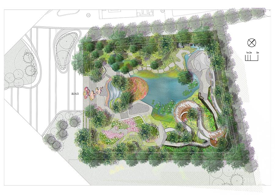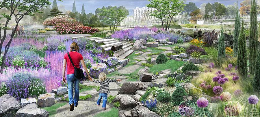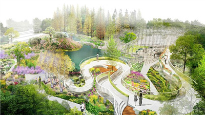 在鋪裝、扶手欄桿、座椅、小品構(gòu)筑物、展示輔助系統(tǒng)等其他細節(jié)中,設(shè)計師們還從繪畫藝術(shù)中獲取靈感,借鑒暈染、潑墨、點彩、涂抹、枯筆等技巧來表現(xiàn)不同質(zhì)感的植物造景。