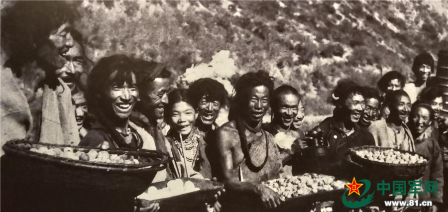 巴塘地區(qū)藏民在金沙江邊手捧各種食品,慰勞進(jìn)藏的十八軍部隊(duì)。(軍史館供圖,中國(guó)軍網(wǎng)記者喬楠楠翻拍)