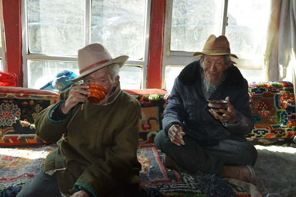 普布多吉和普布國杰兩位老人正用早茶。記者 扎西頓珠 張斌 攝