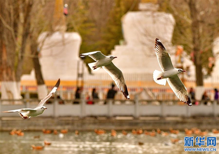 紅嘴鷗在拉薩龍王潭公園的水面上盤旋(3月14日攝)。新華社記者 張汝鋒 攝
