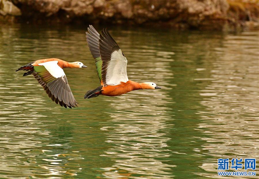 兩只赤麻鴨從拉薩龍王潭公園的水面上飛過(guò)(3月14日攝)。新華社記者 張汝鋒 攝
