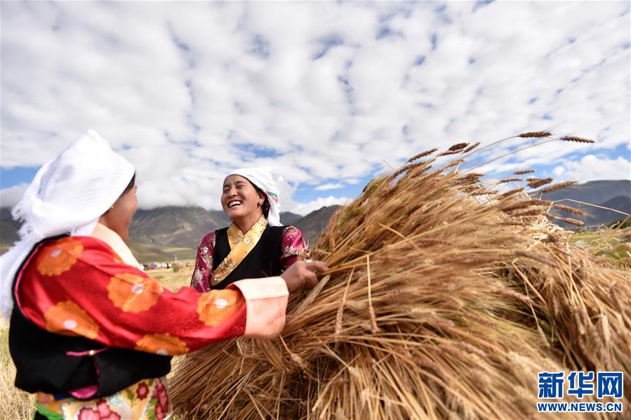 2018年9月23日,拉薩市林周縣松盤(pán)鄉(xiāng)松盤(pán)村兩名藏族農(nóng)民在麥子堆旁聊天。新華社記者 覺(jué)果 攝