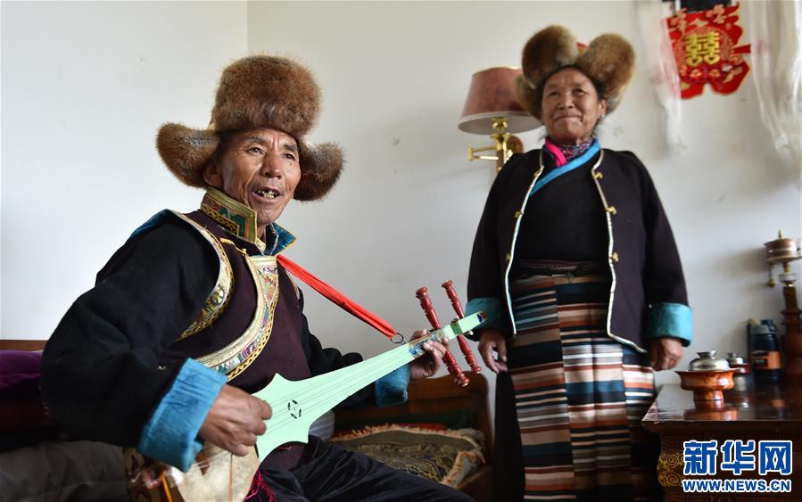 2018年10月9日,在山南市乃東區(qū)老年福利院,64歲的次仁多吉為老伴彈奏扎年琴。他倆是在養(yǎng)老院相識(shí)相愛(ài)結(jié)婚的。新華社記者 覺(jué)果 攝