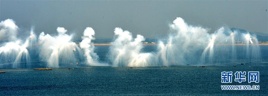 2016年9月18日,中俄“海上聯(lián)合-2016”演習(xí)舉行立體奪控島礁演練。這是掩護(hù)陸戰(zhàn)隊(duì)員沖灘的煙幕彈在空中炸開(資料照片)。新華社發(fā)(孫宏韜 攝)
