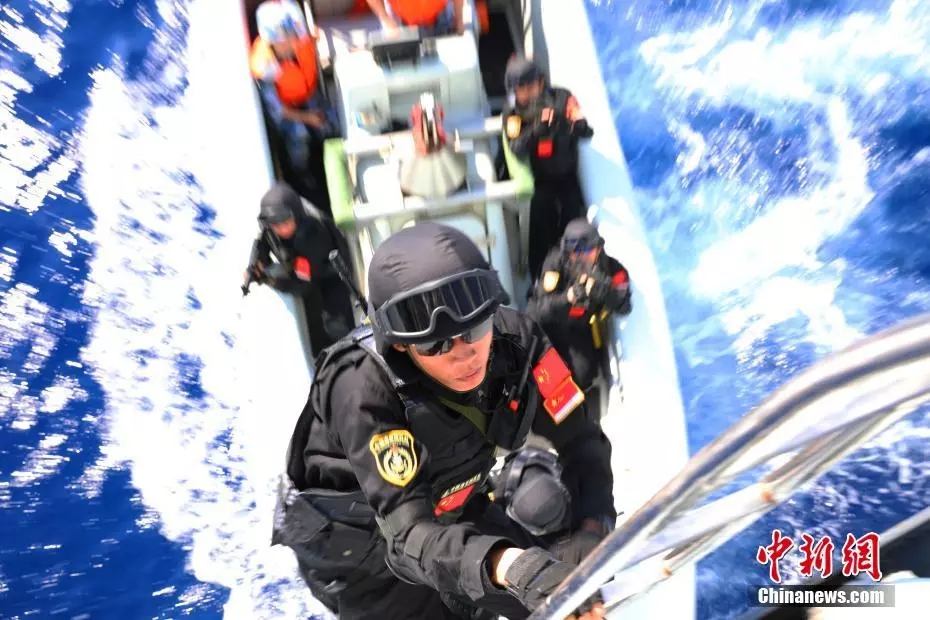 資料圖:今年4月,海軍第32批護航編隊在前往亞丁灣、索馬里海域途中,組織開展艦機協(xié)同、直升機滑降、小艇攀爬、艙室搜索等護航針對性訓練,進一步鞏固提升官兵護航核心能力。圖為特戰(zhàn)隊員進行小艇攀爬訓練。中新社發(fā) 李昊 攝