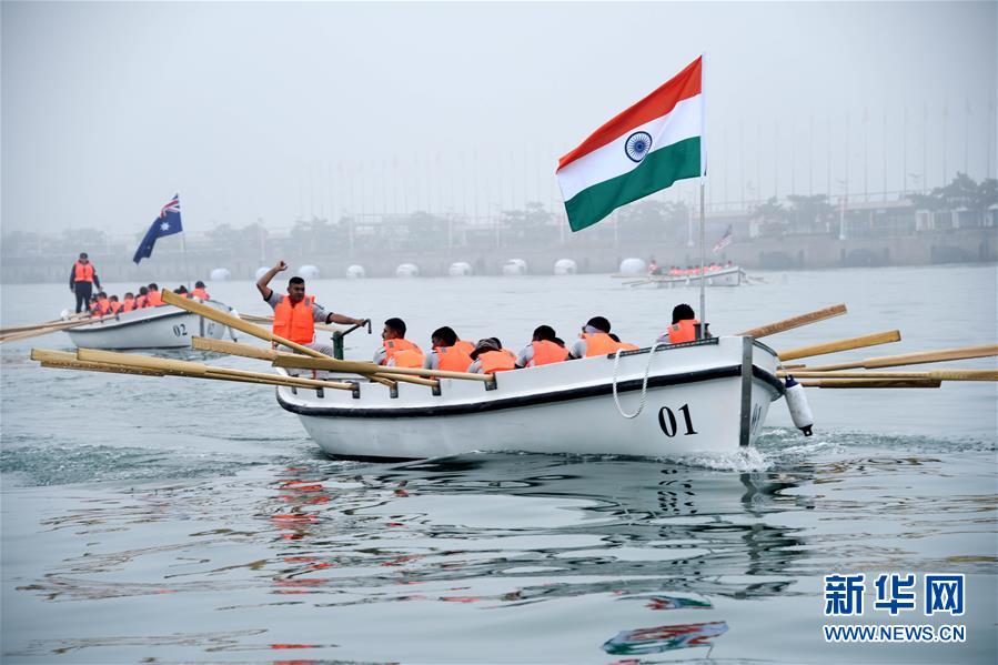 4月24日,參賽隊(duì)在比賽中。當(dāng)日,中國人民解放軍海軍成立70周年多國海軍活動舢板比賽在青島奧林匹克帆船中心舉行,8支來自各國的參賽隊(duì)伍展開角逐,最終中國海軍代表隊(duì)獲得冠軍。新華社記者 李紫恒 攝