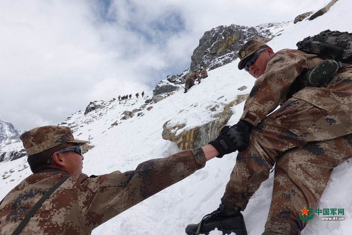 徒步硬闖封山期里的卓拉哨所,步步驚心。下士蔣態(tài)飛體能較好,每遇艱險路段都要回頭幫助戰(zhàn)友。中國軍網(wǎng)記者柳軍 攝