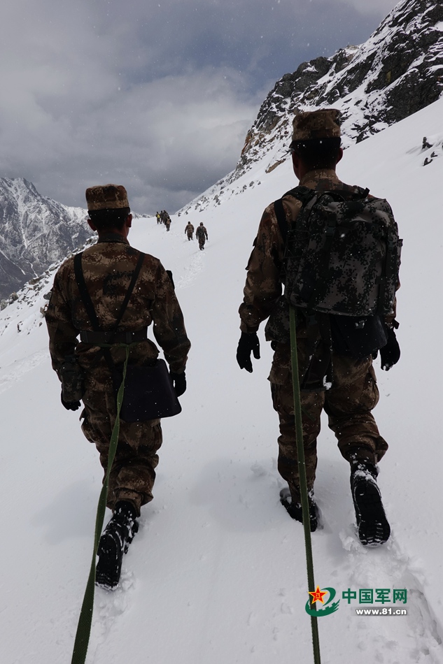 鏡頭里的兩名戰(zhàn)友,是有名的耐力王和爬坡王,他們身后的“救命繩”,拴住的正是年近花甲的記者。中國軍網(wǎng)記者柳軍 攝
