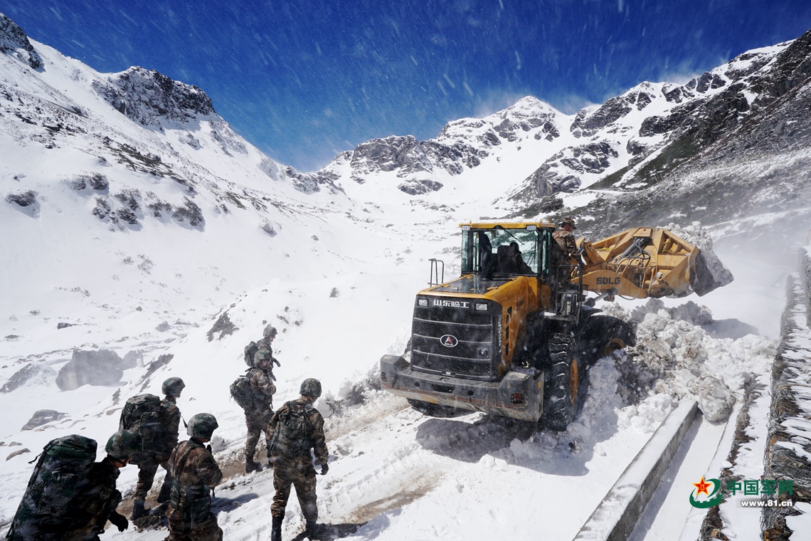 采訪組跟隨在達(dá)姆拉山口巡邏的小分隊一路前行。由于積雪厚達(dá)一至兩米,巡邏車輛無法前行,他們動用推土機(jī)掀翻云天雪海。中國軍網(wǎng)記者柳軍 攝