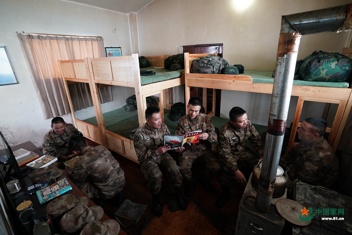 晚飯后,四級(jí)軍士長(zhǎng)楊東儒(左三)與戰(zhàn)友們各得其樂,整個(gè)哨樓彌漫著書香棋韻。中國(guó)軍網(wǎng)記者柳軍 攝