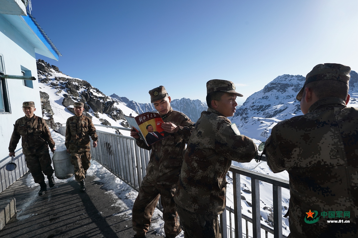 卓拉哨所雖然天無(wú)一日晴、風(fēng)無(wú)一日停,但4月21日卻是難得的好天氣。喜歡攝影的排長(zhǎng)李舒(中)一邊享受日光浴,一邊翻看珍藏的《解放軍畫(huà)報(bào)》。中國(guó)軍網(wǎng)記者柳軍 攝