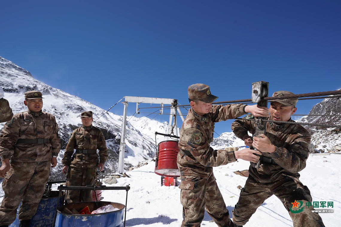 上士雷文龍和中士李平合力固定滑輪,做好空運準備。中國軍網(wǎng)記者柳軍 攝