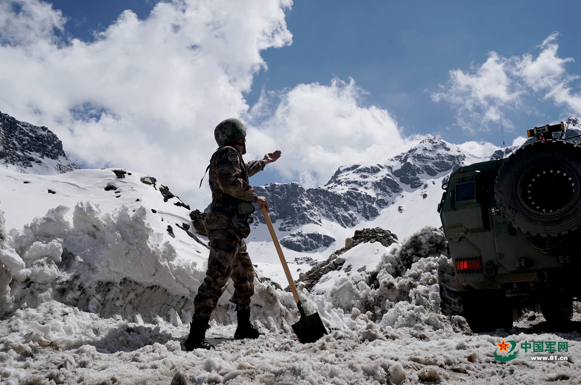 巡邏分隊(duì)在推土機(jī)開(kāi)路的同時(shí)配合人工挖雪,以確保當(dāng)日?qǐng)?zhí)勤任務(wù)的順利完成。中國(guó)軍網(wǎng)記者柳軍 攝