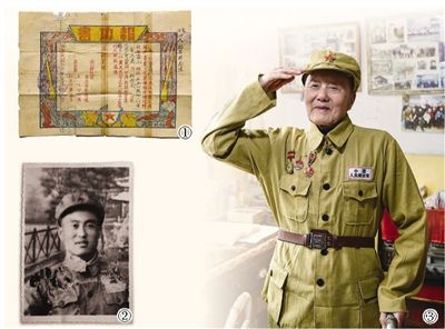 圖①:張富清當(dāng)年的報(bào)功書翻拍。圖②:張富清年輕時的照片翻拍。新華社記者 程 敏攝圖③:張富清近照。本報(bào)記者 田豆豆攝