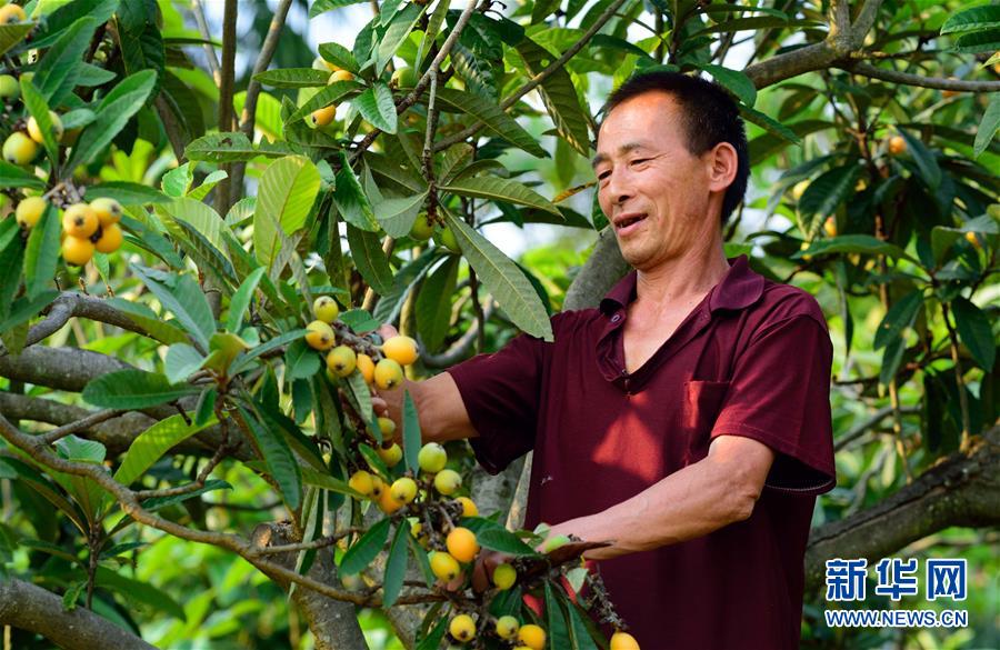 沙洲村村民朱和勇給自家的枇杷樹剪枝(4月22日攝)。 新華社記者 范軍威 攝