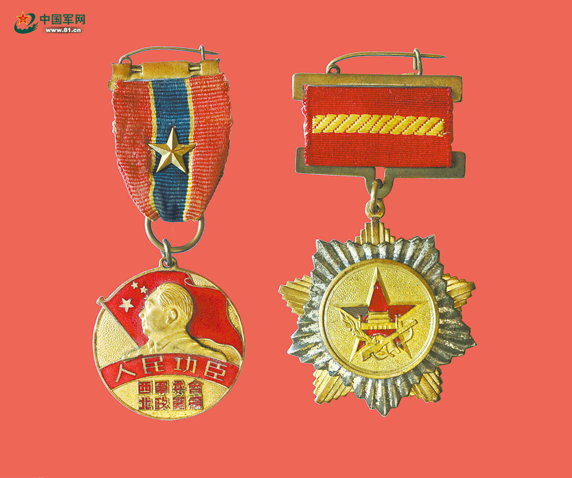 張富清獲得的“人民功臣”獎(jiǎng)?wù)拢ㄗ螅┖图o(jì)念章。