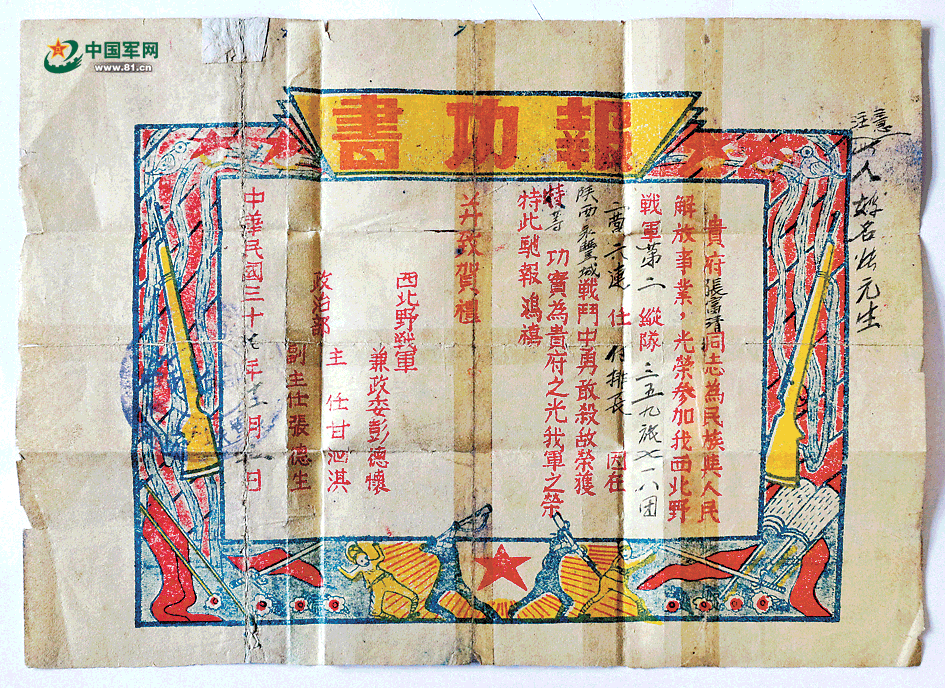 解放戰(zhàn)爭時(shí)期,張富清立功時(shí)的報(bào)功書。中國國防報(bào)記者 穆可雙攝