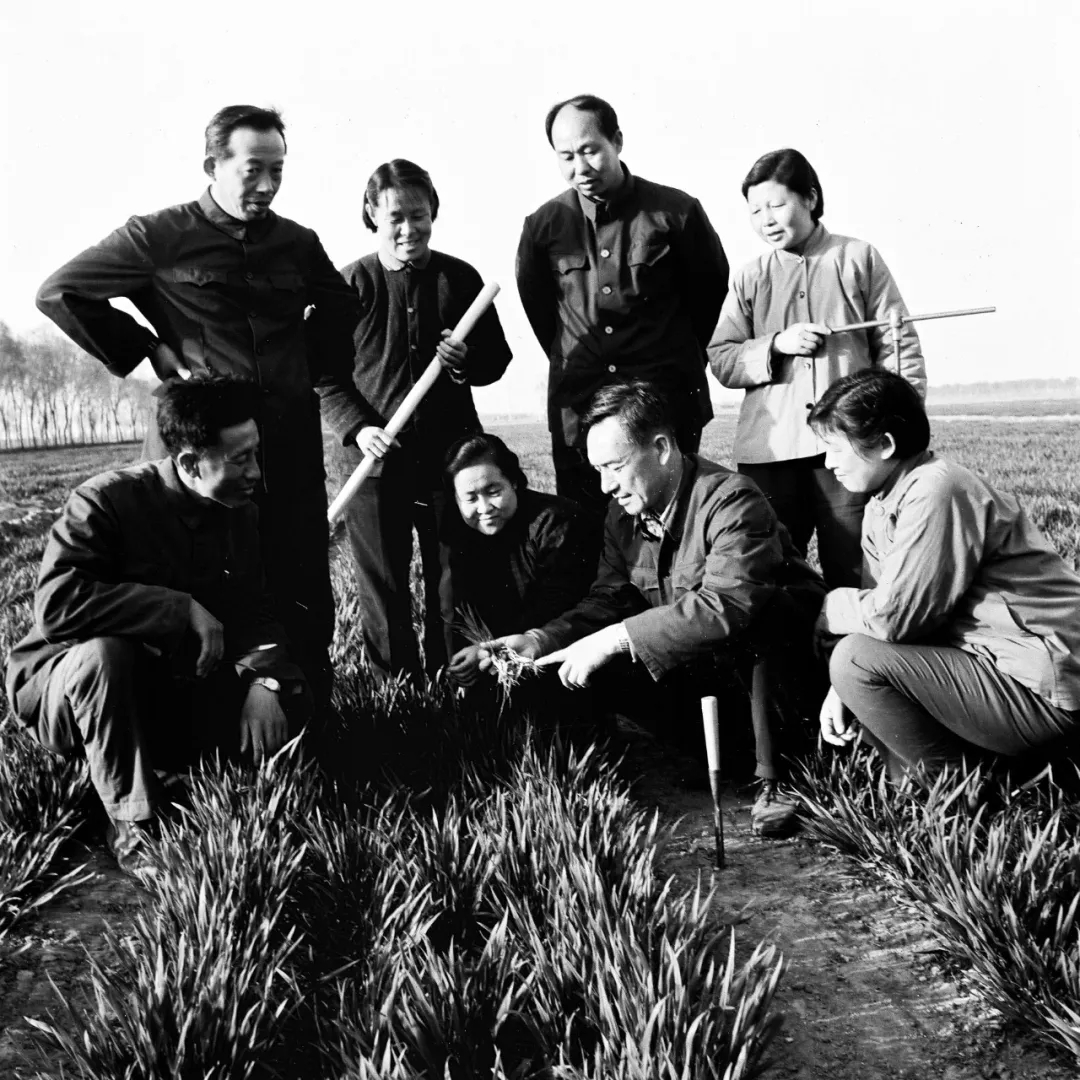 ↑上世紀(jì)70年代,農(nóng)大教師在田間分析苗情。