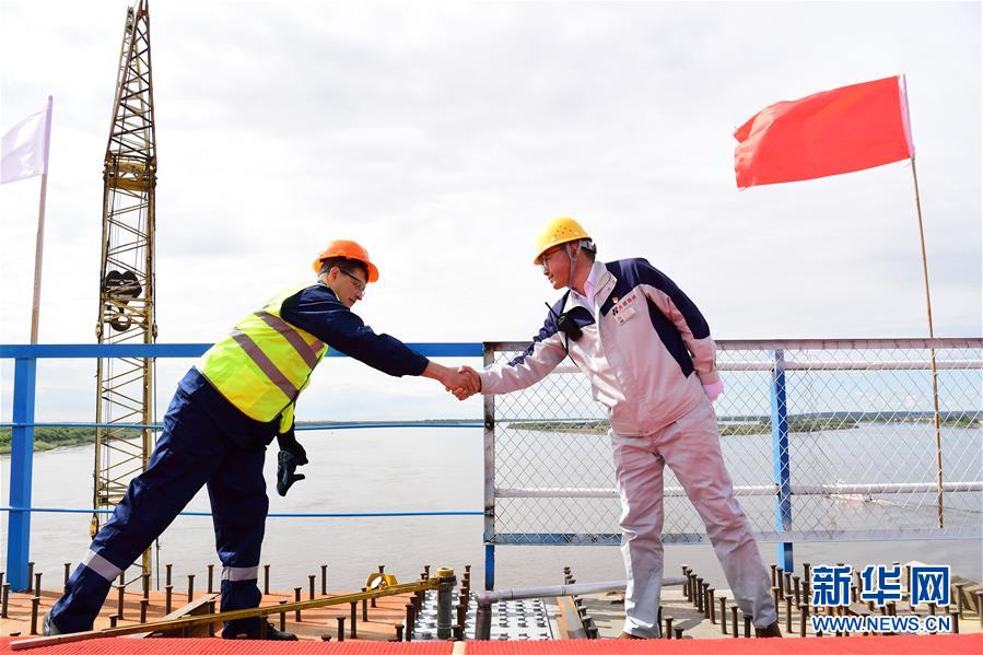 5月31日,中俄雙方建設(shè)者合力將螺栓安裝到合龍塊上后握手。新華社記者 王建 攝