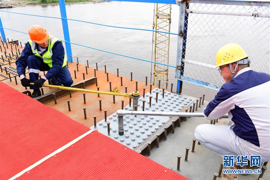 5月31日,中俄雙方建設(shè)者將螺栓安裝到合龍塊上。新華社記者 王建 攝