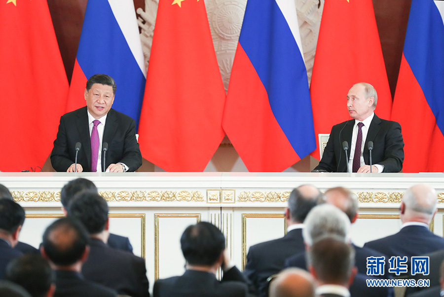 6月5日,國(guó)家主席習(xí)近平在莫斯科克里姆林宮同俄羅斯總統(tǒng)普京會(huì)談。這是會(huì)談后,兩國(guó)元首共同會(huì)見記者。 新華社記者 姚大偉 攝
