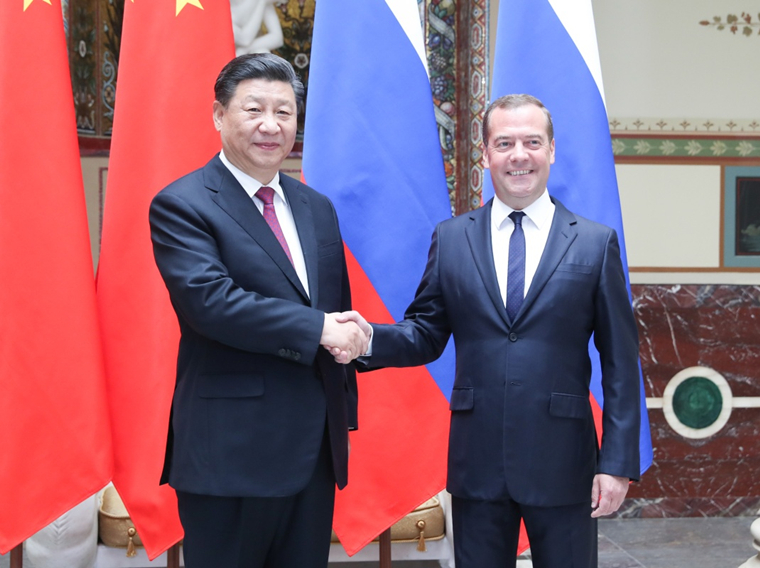 6月6日,國家主席習(xí)近平在莫斯科會見俄羅斯總理梅德韋杰夫。新華社記者 姚大偉 攝