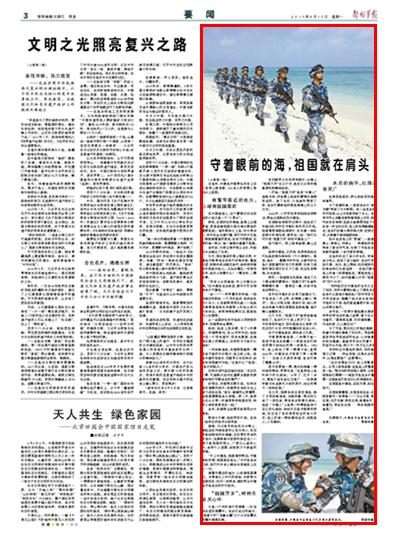 他們駐守在西沙群島最南端的中建島。那里面積不足1.2平方公里,常年高溫、高濕、高鹽、高日照。漲潮時,島礁露出海面部分只有2個足球場大小;臺風(fēng)來了,整個島礁幾乎被海水淹沒;退潮后,小島又變成烈日炙烤下的“南海戈壁”……請關(guān)注今日出版的《解放軍報》的詳細(xì)報道——