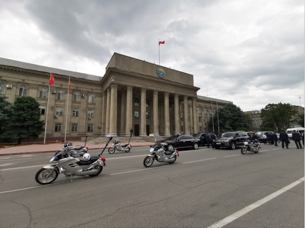 △當(dāng)天下午三點(diǎn),迎接習(xí)近平的車隊(duì)在比什凱克老市政府門前列隊(duì),準(zhǔn)備前往瑪納斯國(guó)際機(jī)場(chǎng)。(央視記者張曉鵬拍攝)