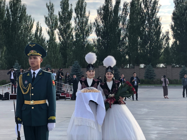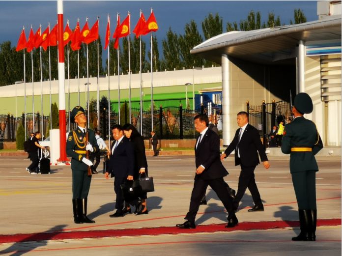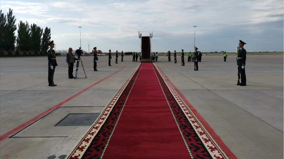 △吉爾吉斯斯坦總統(tǒng)熱恩別科夫親自到機(jī)場(chǎng)迎接。(央視記者張曉鵬拍攝)