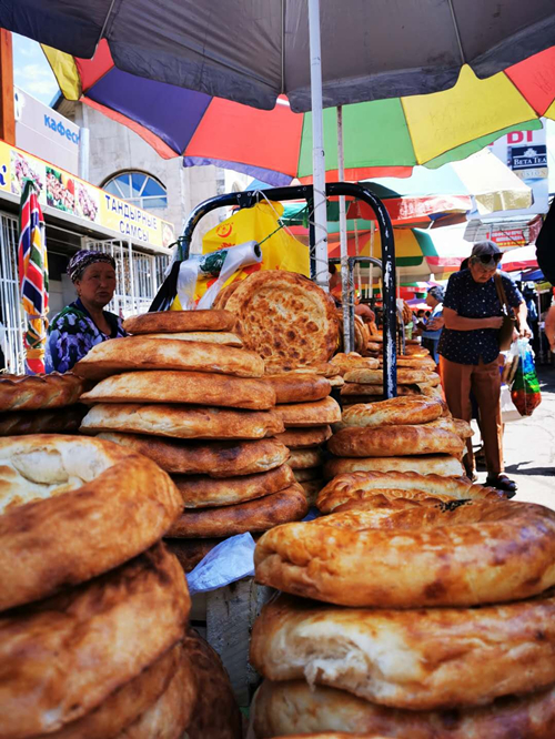 △別列科特綜合大市場(chǎng)賣馕的攤位。(央視記者荊偉拍攝)