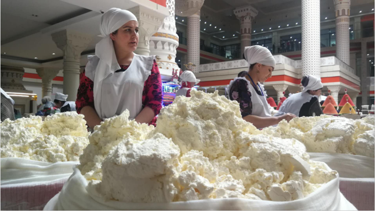 2014年習(xí)主席到訪塔吉克斯坦時(shí),拉赫蒙總統(tǒng)邀請(qǐng)他來(lái)到國(guó)賓館,特意在涼亭旁安排了大巴扎展示,并介紹了當(dāng)?shù)赝撂禺a(chǎn)和馕、抓飯、拉條子等特色飲食。元首外交透著濃濃的生活氣息。